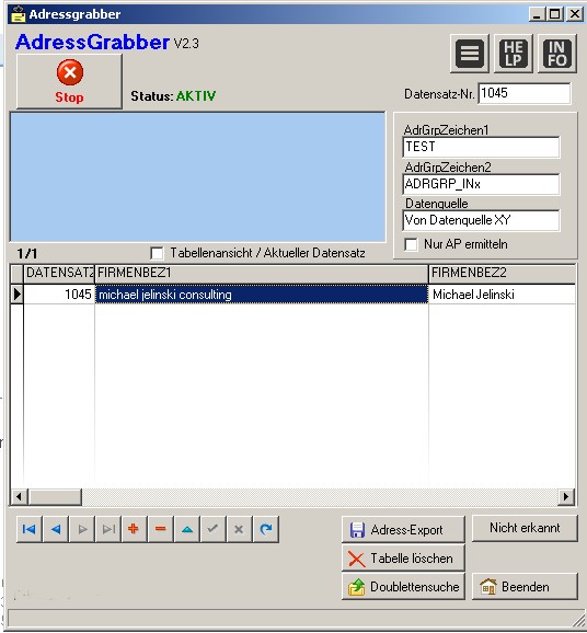 Sie möchten für Ihren Vertrieb oder Ihre Marketingabteilung schnell und einfach eine Adresse aus einer Textdatei oder dem Internet in Ihr Datenbanksystem übernehmen. Mit dem AddressGrabber ist es Ihnen möglich eine Adresse mit einer guten Erkennungsrate aus einer Textdatei zu erkennen. Dazu wird einfach der Adressdatensatz markiert und per Klick in die Datenbank übernommen. Die strukturierten Daten lassen sich dann in z.B. in einem CSV-Format speichern und direkt in Ihr Datenbanksystem importieren.